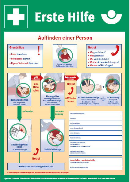 So sind lt. BGV A1 §26 ein gewisser Prozentsatz der Beschäftigten als Erst-Helfer auszubilden und im 2-jährigen Turnus nachzuschulen.