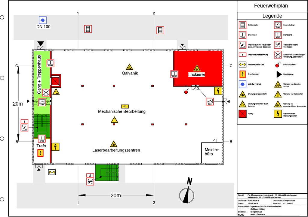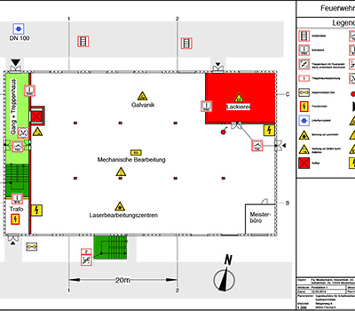 Wir erstellen anhand eines Brandschutznachweises Feuerwehrpläne nach DIN 14095 und stimmen diese mit der örtlichen Feuerwehr ab. Diese Pläne sind für den vorbeugenden und abwehrenden Brandschutz wichtig und werden von den Behörden vermehrt eingefordert. Sie sind für den Unternehmer bei baulichen und anlagentechnischen Veränderungen ein zusätzlicher Hinweis auf Gefahrenstellen, die er zusätzlich zu beachten hat. Für die Feuerwehr sind sie die erste Informationsquelle zum abwehrenden Brandschutz. So sind in diesen Plänen wichtige Informationen zur baulichen Ausstattung des Objektes enthalten.